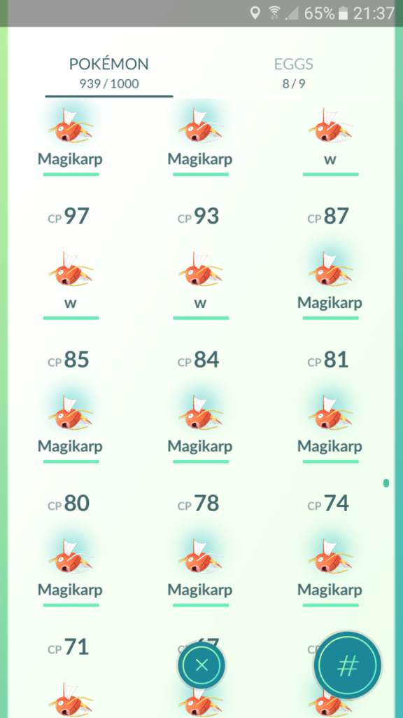 První den jsem zajel s kámošem do města nasbírat nějaké Pokébally a zároveň zkusit pochytat co možná nejvíce Magikarpů. Vzhledem k tomu, že se zdržují kolem Pokéstopů, tak to nebyl zas takový problém. Ve městě jsme to nevydrželi a pobořili i pár gymů. Celkem jsem za den nachytal 72 Magikarpů. Většinu právě ve městě.